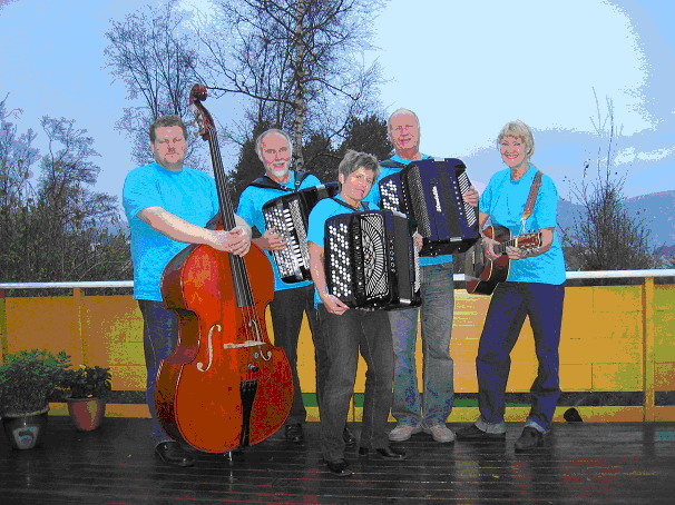 Fra venstre: Jan Thorsen på slagverk, Morten Bollerud trekkspill, Gudny Dahlen, Jan Johannesen gitar, og Hans Olav Anthonsen bass.