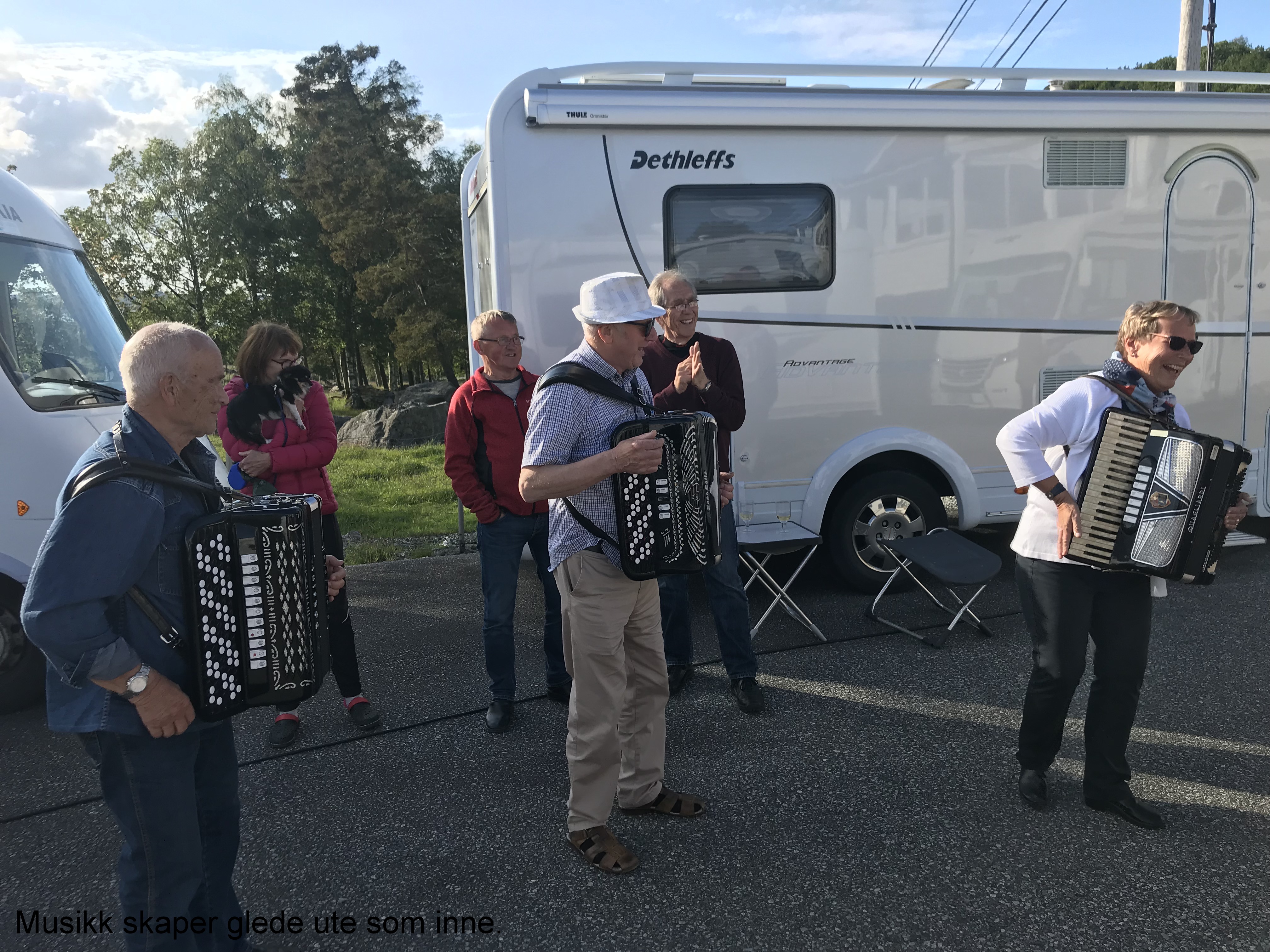 Vi ble, som dere skjønner, godt mottatt fra første stund. Trekkspillmusikken runget over tunet etter meget kort tid, og flere kastet seg på å spille.
